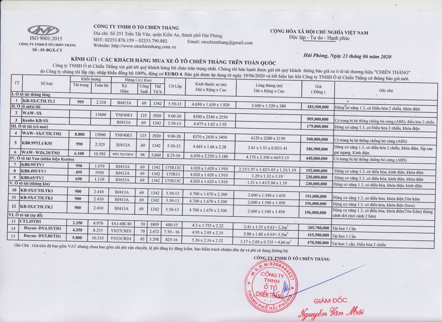 Nhà máy ô tô Chiến Thắng niêm yết giá xe tải Kenbo, xe bán tải Kenbo năm 2020. Niêm yết giá bán lẻ thị trường xe ô tô tải KENBO. Văn bản này được áp dụng đối với tất cả các đại lý xe ôtô Kenbo trên toàn quốc. Giá bán này được quy định niêm yết tại công ty và được áp dụng từ 07/01/2020