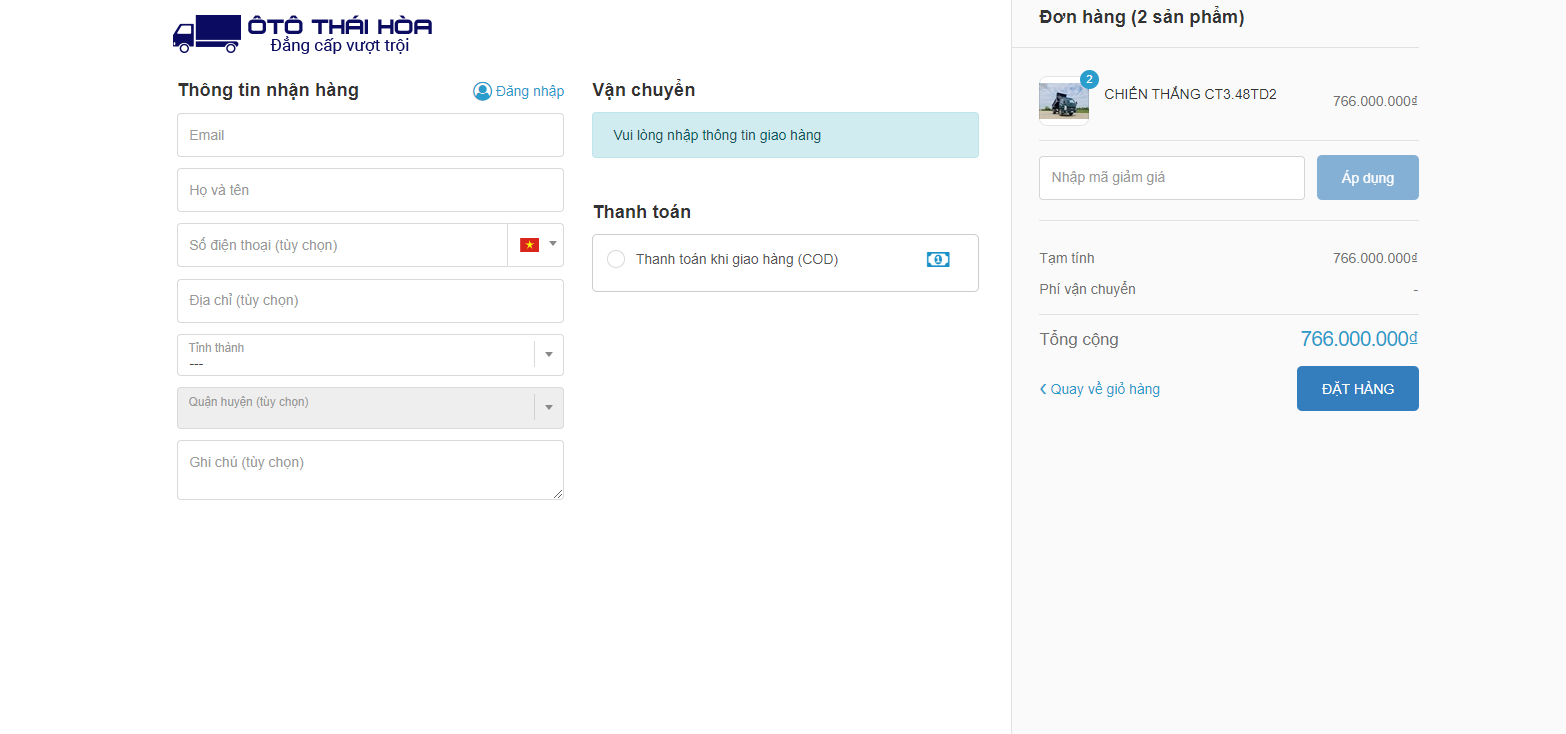 Bước 4: Tại mục này, bạn nhập đầy đủ thông tin như yêu cầu để ô tô Thái Hòa tiếp nhận thông tin và lên đơn hàng cho bạn. Nếu có yêu cầu về thời gian giao hàng hãy "Ghi chú" để chúng tôi nắm được nhé. Sau đó nhấn "Đặt hàng"
