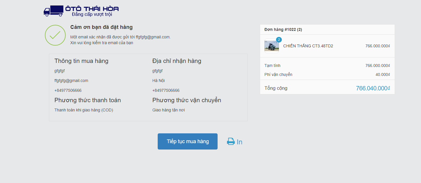 Bước 5: Khi màn hình hiển thị "Tiếp Tục mua hàng" là bạn đã đặt hàng thành công. ô tô Thái Hòa tiếp nhận đơn và liên hệ ngay với bạn trong ngày !